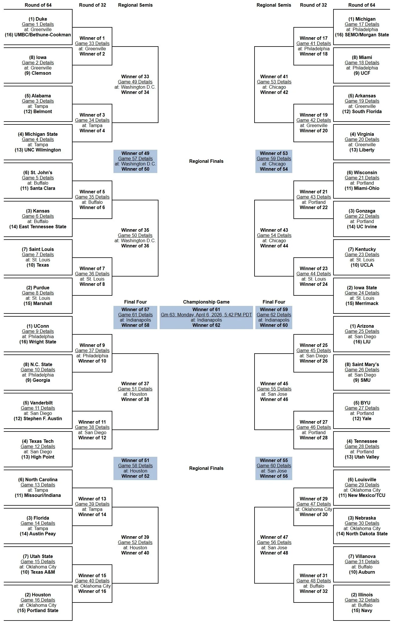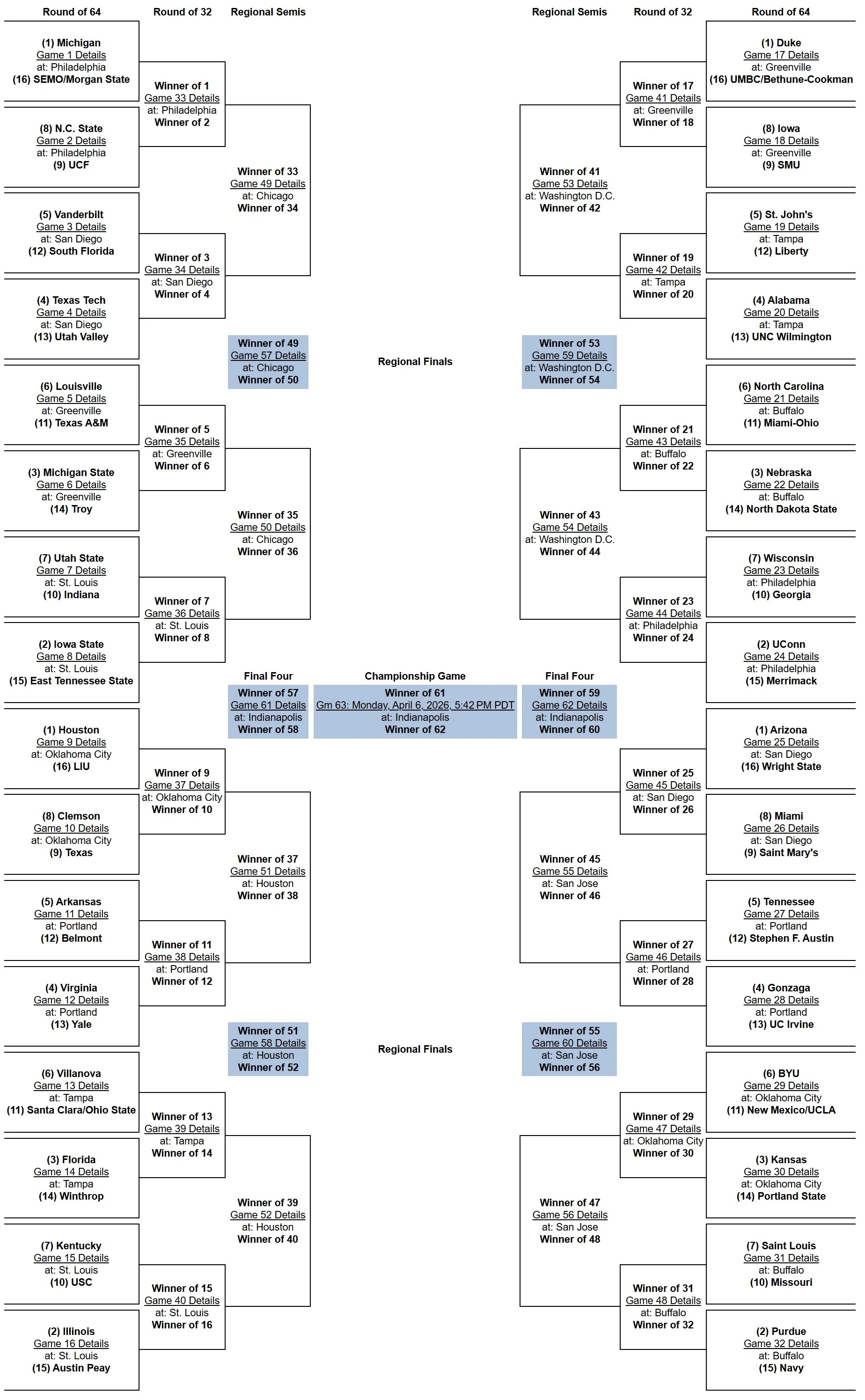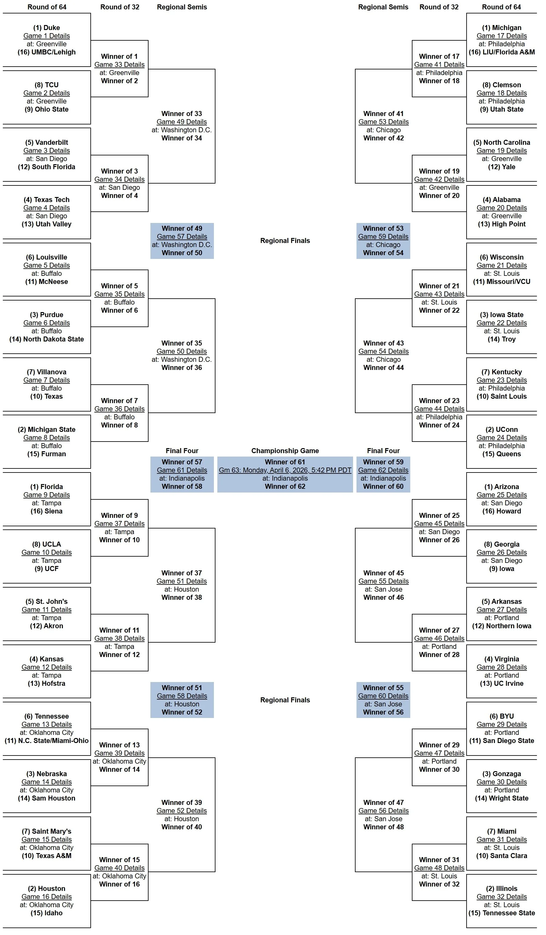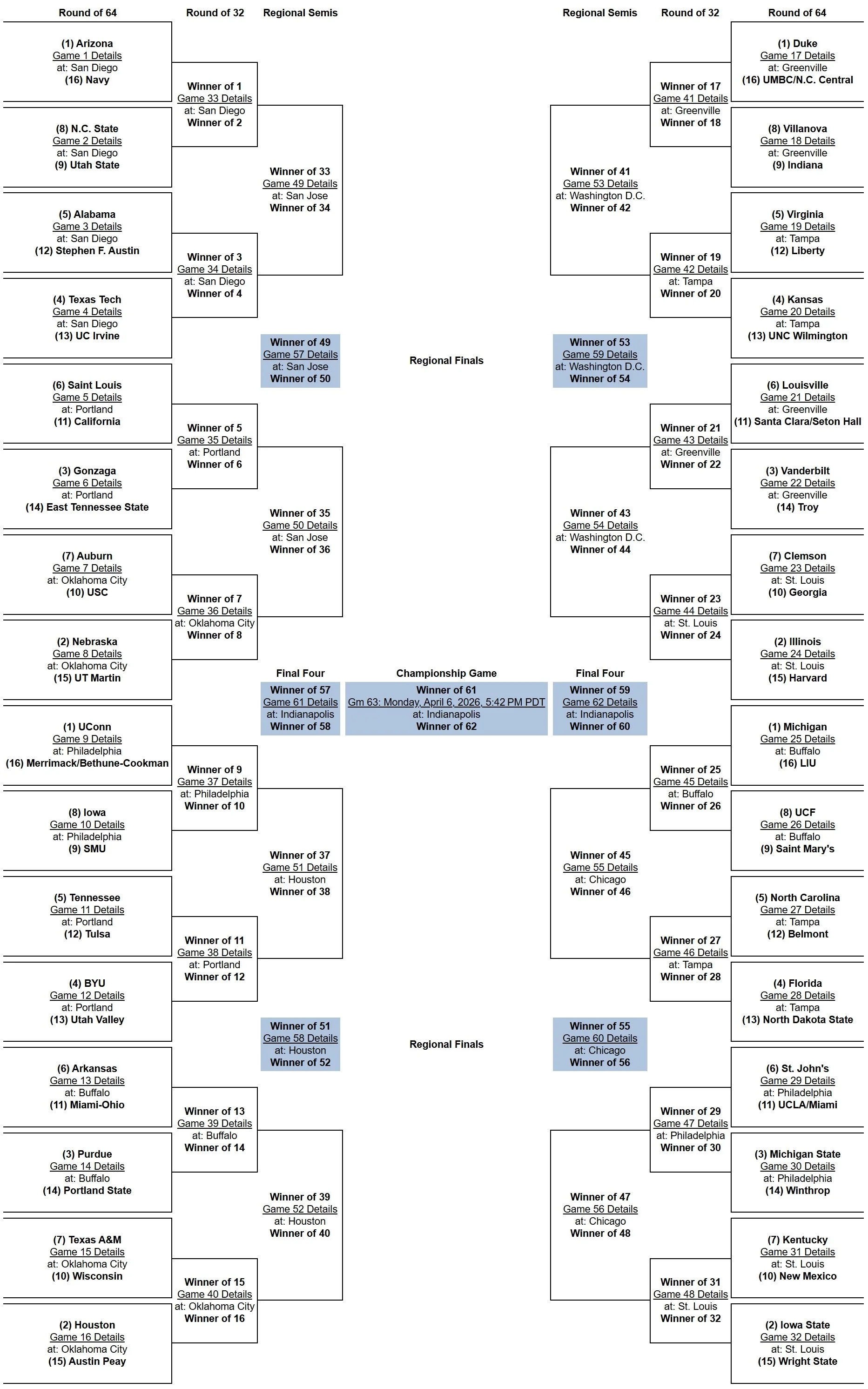 Bracket projections are based on the 2025-26 NCAA Committee Principles and Selection Process. Projected Conference Champions are based on which team has the inside track to the top seed within its conference tournament.