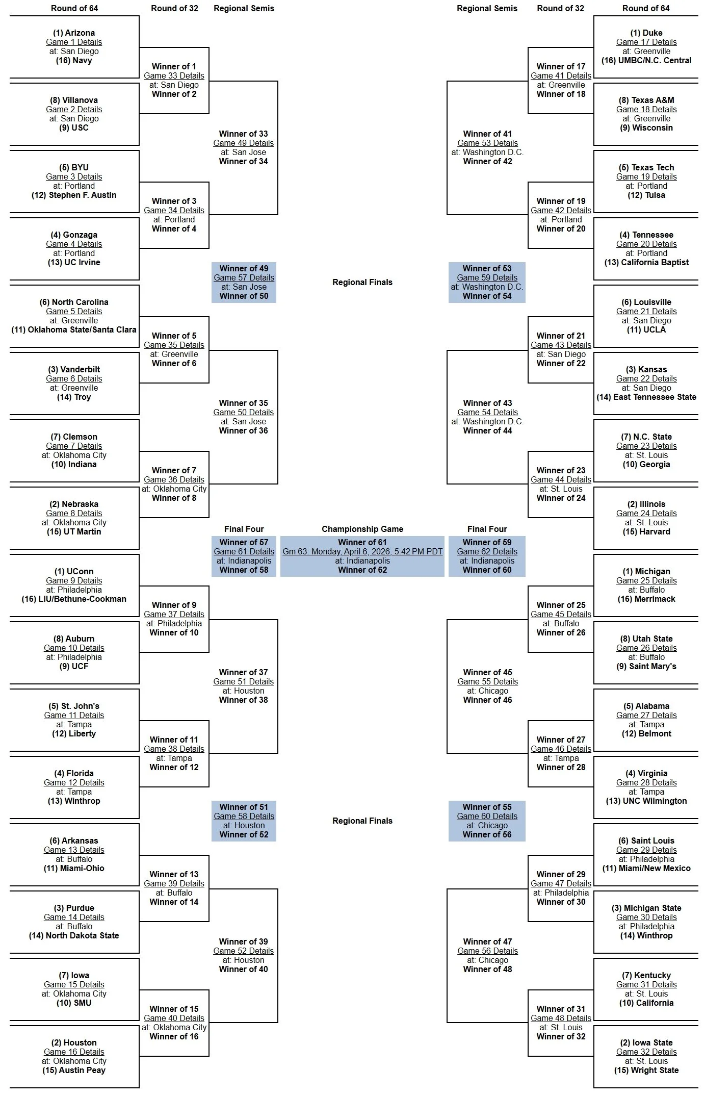 Bracket projections are based on the 2025-26 NCAA Committee Principles and Selection Process. Projected Conference Champions are based on which team has the inside track to the top seed within its conference tournament.