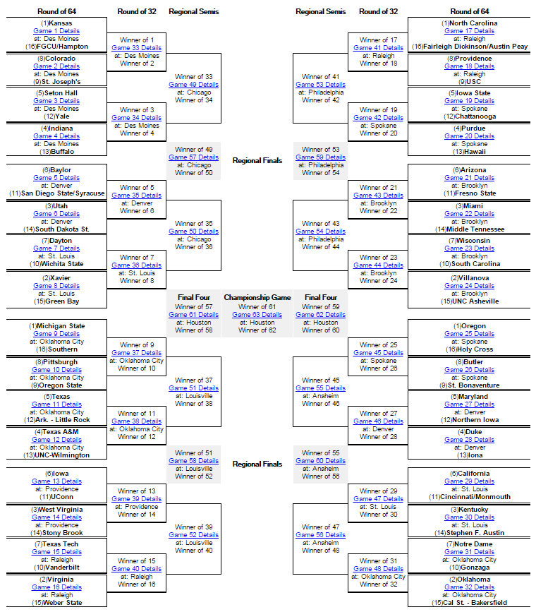 Final Bracket FIRST FOUR TEAMS OUT: Michigan, Saint Mary's, Temple, TulsaNEXT FOUR TEAMS OUT: VCU, Valparaiso, Florida, Hofstra