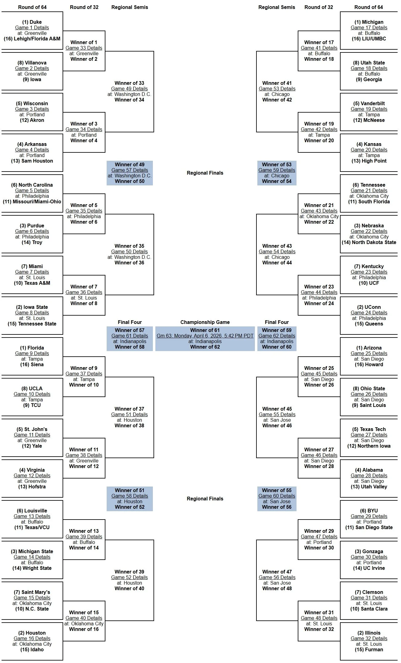 Bracket projections are based on the 2025-26 NCAA Committee Principles and Selection Process. Projected Conference Champions are based on which team has the inside track to the top seed within its conference tournament.