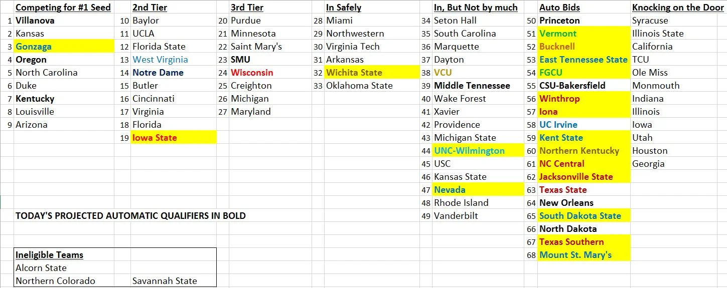 7pm Seed List 03.11.17 Prior to the Full Bracket Exercise, this is where I have my Seed List right this second.