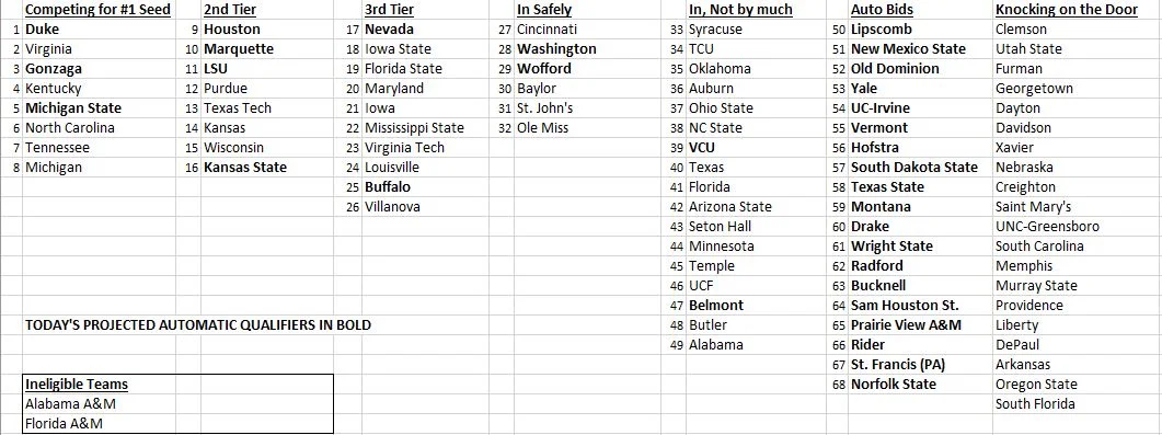 Minnesota’s loss to Rutgers and Seton Hall’s recent funk has entered both squads into this uncomfortable danger zone. Meanwhile Florida, is passing teams like the Gophers and Pirates due to gathering a signature win at LSU. The reality is we are likely to see a few bids taken away from a couple of these teams due to conference tournament winners snagging auto bids. So if you are a bubble team in this area, there is no such thing as “safe.” The cutoff line will be very fluid during Championship Week, just as it has all season here at bracketeer.org.